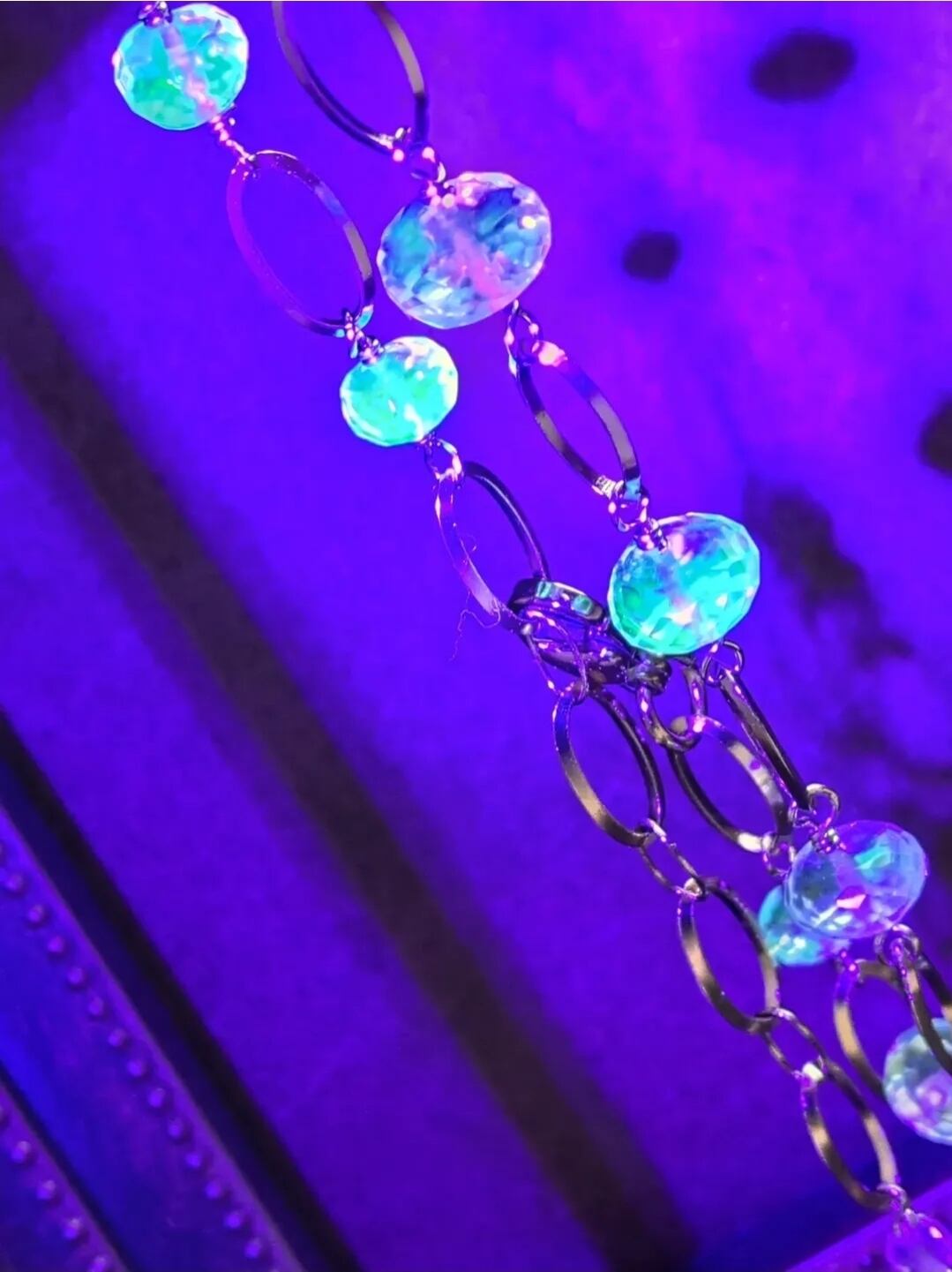 大きめのオーバルチェーンをカットして紡いだので、どこでもカニカンで留められます。