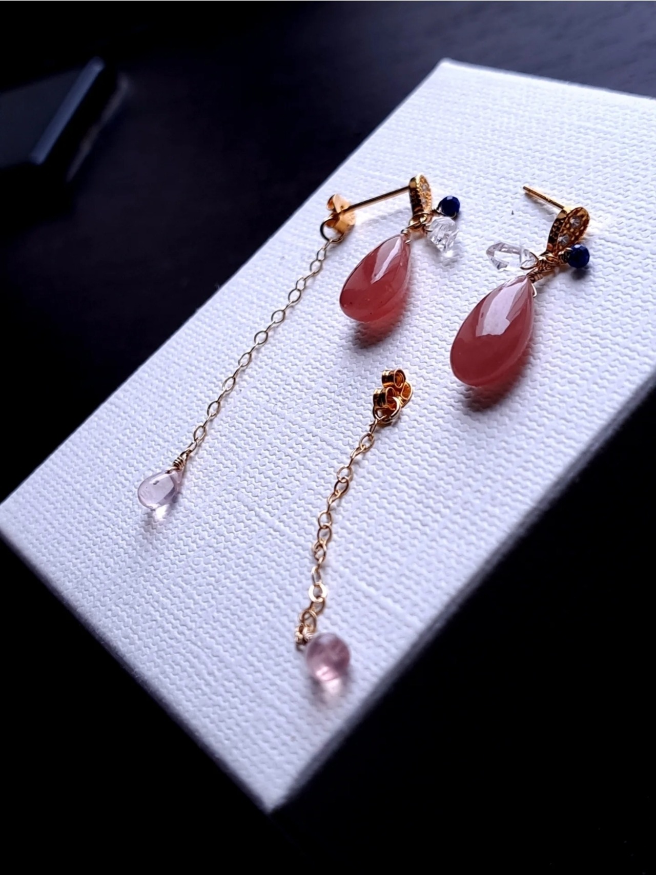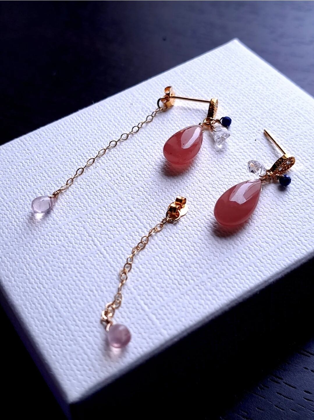 パキスタン水晶とラピスラズリでキュ、としまるけどピアスキャッチから揺れるローズクォーツは甘く可憐です。このローズが透明感と発色良く、可愛いったらない。