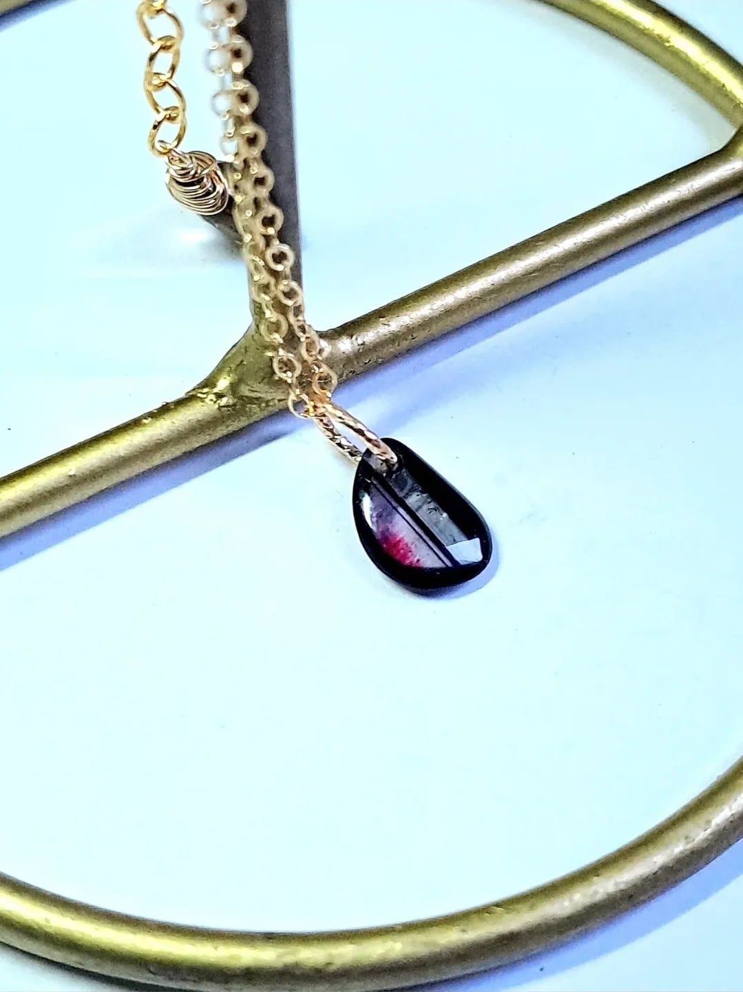 アジャスターエンドにも多色のトルマリンを…と何粒もある中から、これしかない!と思った粒には虹も入っていました。